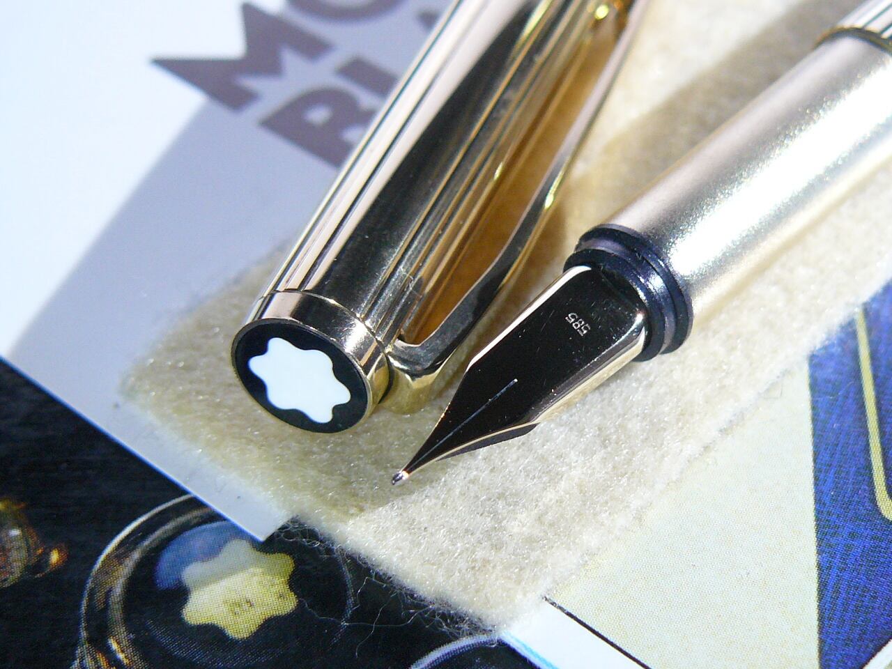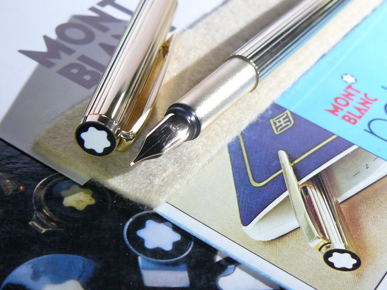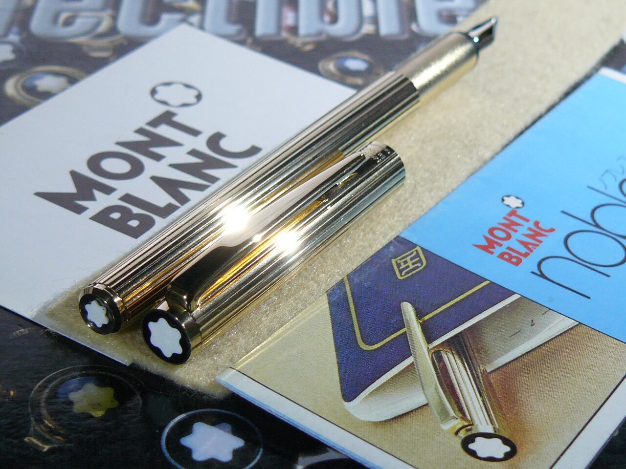★※期間限定1点\23,800円※★今回長年収集したコレクションの中より限定の出品です!美しく輝く!現存します綺麗な品は入手困難な貴重な逸品になります★非常に綺麗な貴重で希少な価値ある保管品!★ノブレス・シリーズの最高峰!★金運を呼ぶ黄金色の総金張りのボディ軸逸品!★非常に価値の高い ”総金張り”ゴールド・プレート装飾★モンブラン社製★No.1147★ダイヤモンド・カット★<<ファウンテン・ペン>>万年筆です★その価値の高さは、販売当時マイスター・シュテュックNo.146と同じような高額な定価で販売されていました高級なハイレベルな品です、ノーマルのノブレス・万年筆が約4本購入できる金額で販売されていた高価な価値ある逸品です!★ペン先までもゴールド・プレートのペン先には”585”の刻印が刻まれています、ペン先のニブのサイズはEFとなります★こちらの総金張りのノブレスの製造過程には、ボディ軸を総金張りのダイヤモンドカット・ストライプの表面に腐食防止と装飾用のゴールドプレート・コーティング加工を施した手間の掛かっている逸品です!驚いた事に販売当時、通常のノブレスの約3倍の販売価格で販売されていました!ほとんど知られてはいませんが、このモンブラン社独自のダイヤモンド・カット製法は、ダイヤモンドによる彫工程が3回も彫られる、””3回彫り””により削り出された、精密で正確な施工技術が生み出した、非常にハイ・レベルのクオリティが世界最高峰の筆記具ブランドの証です★ノブレス・バーチカル・ストライプ★最高峰のゴールドプレート装飾★生産終了モデル!★ボディ軸上部に刻まれたMONTBLANCーGERMANY の刻印が”歴史の証人”の証なのだ!★価値の高い総金張りのモンブラン社製の万年筆は、所有する価値の非常に高い逸品です!★
