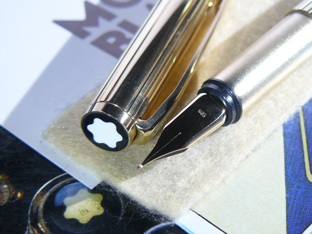 ★※期間限定1点\23,800円※★今回長年収集したコレクションの中より限定の出品です!美しく輝く!現存します綺麗な品は入手困難な貴重な逸品になります★非常に綺麗な貴重で希少な価値ある保管品!★ノブレス・シリーズの最高峰!★金運を呼ぶ黄金色の総金張りのボディ軸逸品!★非常に価値の高い ”総金張り”ゴールド・プレート装飾★モンブラン社製★No.1147★ダイヤモンド・カット★<<ファウンテン・ペン>>万年筆です★その価値の高さは、販売当時マイスター・シュテュックNo.146と同じような高額な定価で販売されていました高級なハイレベルな品です、ノーマルのノブレス・万年筆が約4本購入できる金額で販売されていた高価な価値ある逸品です!★ペン先までもゴールド・プレートのペン先には”585”の刻印が刻まれています、ペン先のニブのサイズはEFとなります★こちらの総金張りのノブレスの製造過程には、ボディ軸を総金張りのダイヤモンドカット・ストライプの表面に腐食防止と装飾用のゴールドプレート・コーティング加工を施した手間の掛かっている逸品です!驚いた事に販売当時、通常のノブレスの約3倍の販売価格で販売されていました!、ほとんど知られてはいませんが、このモンブラン社独自のダイヤモンド・カット製法は、ダイヤモンドによる彫工程が3回も彫られる、””3回彫り””により削り出された、精密で正確な施工技術が生み出した、非常にハイ・レベルのクオリティが世界最高峰の筆記具ブランドの証です★ノブレス・バーチカル・ストライプ★最高峰のゴールドプレート装飾★生産終了モデル!★ボディ軸上部に刻まれたMONTBLANCーGERMANY の刻印が”歴史の証人”の証なのだ!★価値の高い総金張りのモンブラン社製の万年筆は、所有する価値の非常に高い逸品です!★